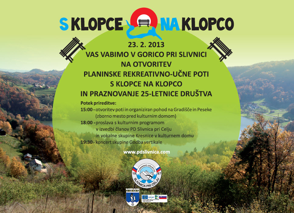 Člani planinskega društva Slivnica pri Celju smo dobro leto delali na projektu planinske rekreativno- učne poti S klopce na klopco. Dela na projektu zaključujemo, zato bomo 23. 2. 2013 pot tudi uradno odprli. Prireditev bomo združili z obeležitvijo 25. obletnice delovanja planinskega društva Slivnica pri Celju.