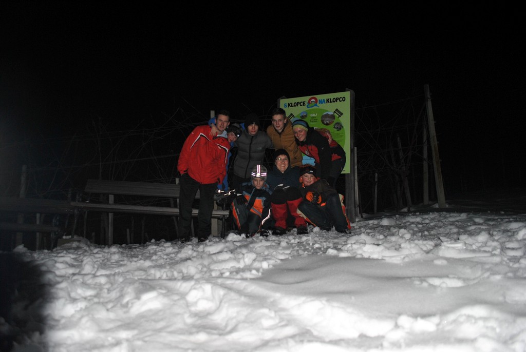 Ob petih popoldan, ko je dolino Slivniško objel mrak, smo se zbrali na avtobusni postaji ter se podali do klopce na Gaju. Po poti ni zmanjkalo časa za kepanje in ostale snežne radosti, ko pa smo se vrnili v dolino, je Boštjan z baklami poskrbel pravljičen pridih pohodu, nato pa smo se ogreli s čajem in se tradicionalno posladkali z Domačico.