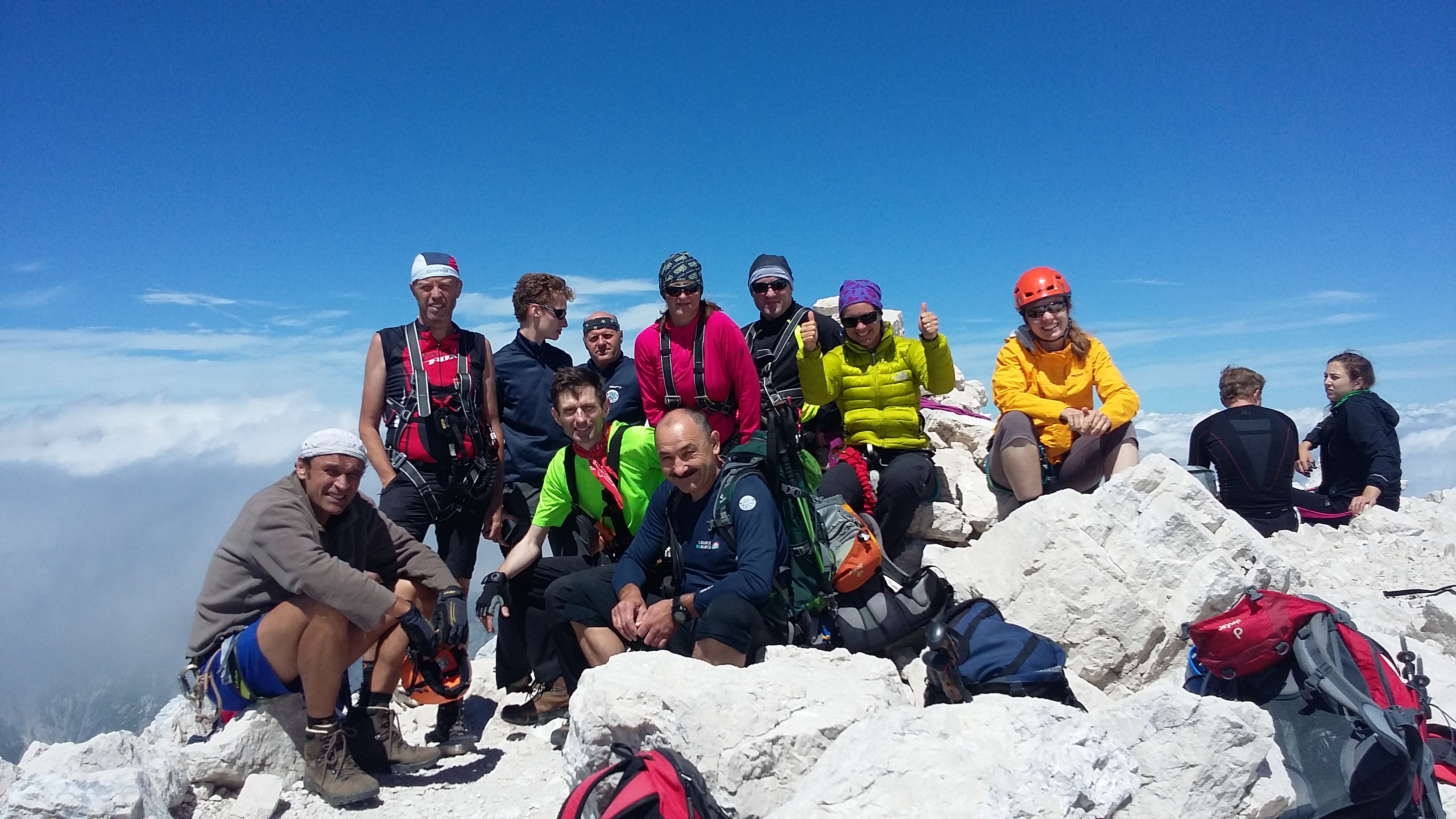 Po prvem okrepčilu v Tamarju se je svetloba sicer skrila za preganjajoče se meglice. Če je tudi to pripisati elektro zasedbi, ne vemo, a vsem nam je ustrezalo, da nas pretirana svetloba in z njo vročina ni osmodila že na začetku. Da pa smo začutili zračnost prostora pod sabo, so se meglice že kmalu po tem, ko smo dobro zajeli širino Kotovega sedla, začele seliti na vršiško stran, nas pa so spet osvetlili sončni žarometi, ki niso popustili vse do vrha. V družbi prijetnih poletnih sapic niti niso bili preveč obremenili. Tudi zato, ker smo imeli pri napredovanju dosti dela s preverjanjem trdnosti koraka in varnosti. Malo čez poldne smo vrh dosegli, naši pogledi pa so bili tudi tam usmerjeni bolj na zahodno stran, proti Mangartu in sosedom, ki so se pustili videti, medtem ko so vzhodno stran še vedno zakrivali oblaki. Le tu in tam se je sramežljivo pokazal Največji in iz nas izvabil ah in oh.