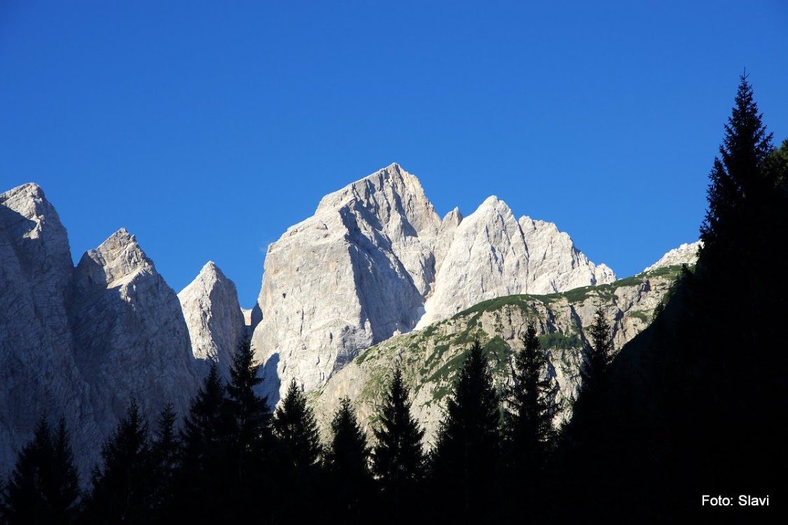 Bilo nas je deset, ki smo jo zadnjo julijsko soboto ob pol sedmih mahnili proti njemu. Med njimi štirje električarji, ki so poskrbeli za primerno jutranjo osvetlitev tega lepotca. Menda naj bi k temu prispevala sicer že poldrugo leto stara združitev Elektra Celje in Elektra Gorenjske. Dolina je bila še v senci, iz nje pa je jutranje ožarjen že svetil on, ki je še v zaspani jutranji korak vnesel kar nekaj več zanosa.